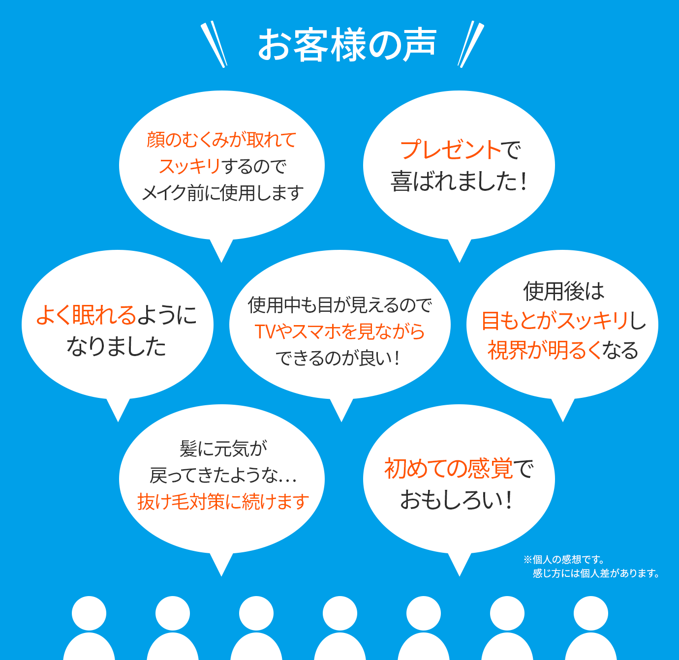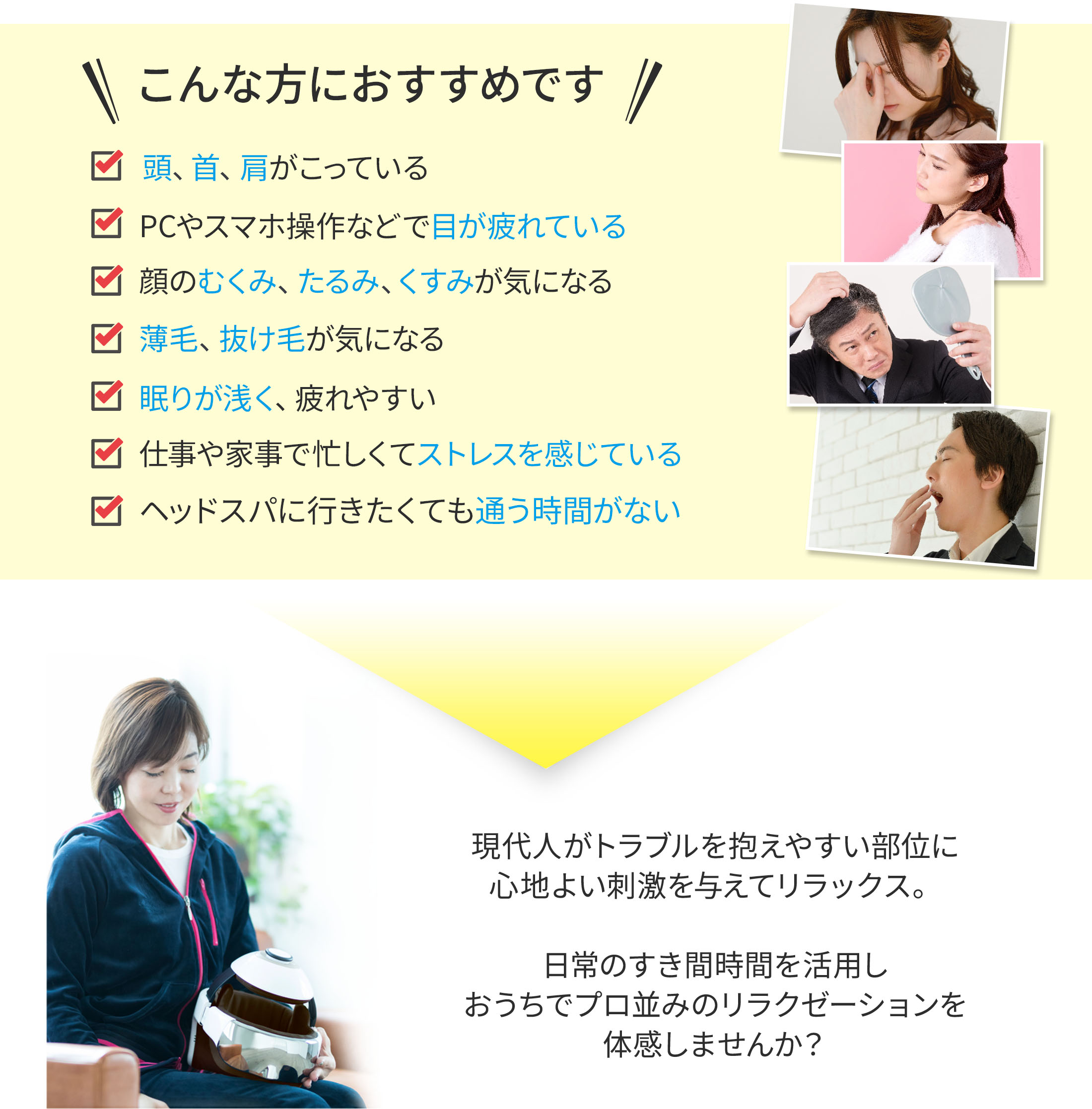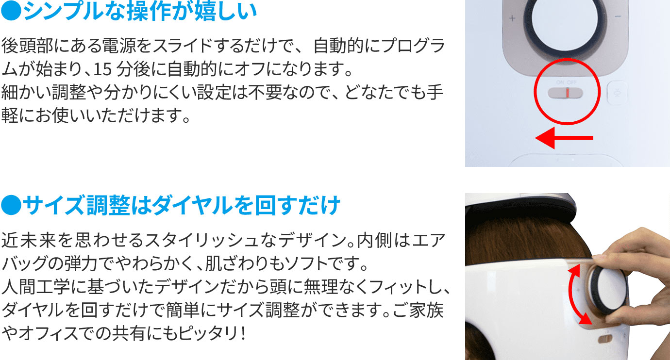 エアバッグが膨らんだり縮んだりを繰り返し、人の手でマッサージを受けているような気持ち良さが味わえます。また、ポイントを押すように設置された複数の細かな突起が頭頂部を心地よく刺激します。