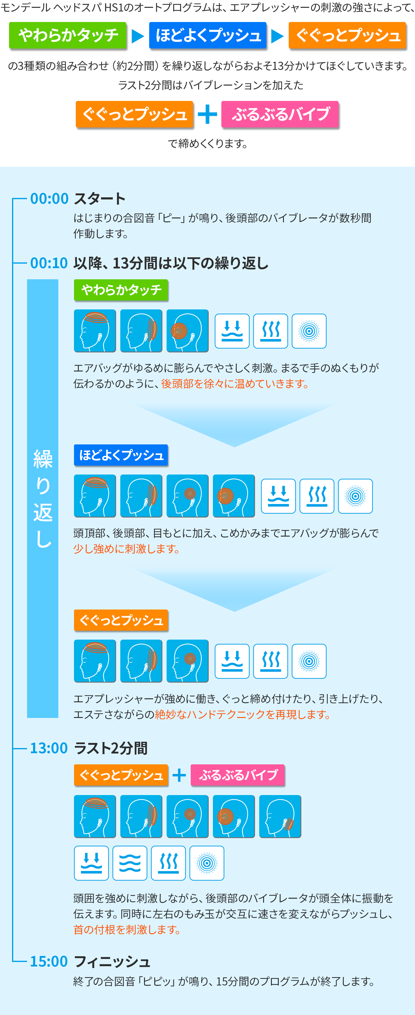 モンデール ヘッドスパ HS1は15分のオートプログラム。 エアプレッシャーで絶妙な刺激の強弱を繰り返しながら、およそ13分かけてほぐしていき、ラスト2分間はバイブレーションを加えた総仕上げです。
