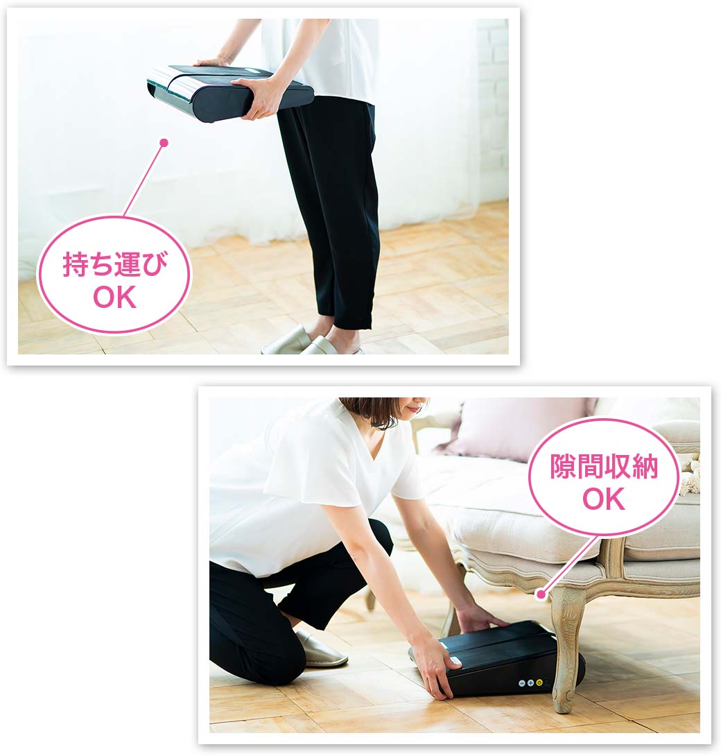 振動マシンは大きくて重たいイメージですが、ぶるぶるビートはスリムなサイズ感で置き場所に困りません。また、重さ約5.7kgと軽量なので移動もラクラク。使いたいときにサッと取り出せる手軽さが嬉しいポイントです。