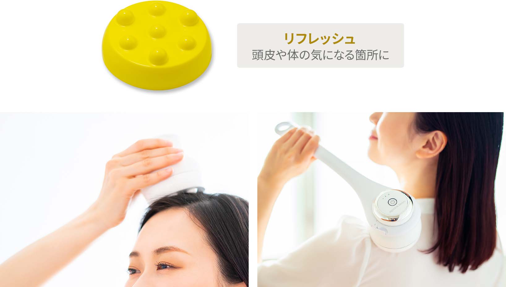 7つの突起がついたリフレッシュアタッチメントは、濡れた肌や保湿クリームなどを塗布した肌、または服の上からも使用できます。頭皮、二の腕、お腹まわり、太もも、ふくらはぎなどの気になる部位に使用すればスッキリ、リフレッシュ。