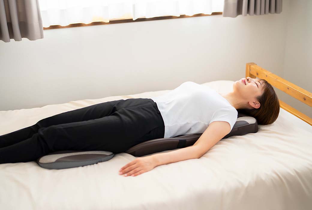 また、椅子やソファに立てかけて寄りかかって使用することはもちろん、床やベッドに広げて寝ながらもご使用いただけます。寝ながら使用することで自重が加わり、より強く深い揉み心地を味わえます。