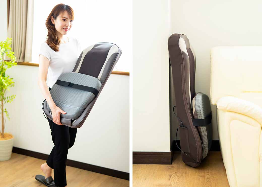 本体重量は約4kgと軽く、厚さは約17cmと薄型。女性でも楽に持ち運びができます。使わないときには座面部分を折り畳んで、ちょっとした隙間に収納することができるので、使用後の置き場所に困りません。