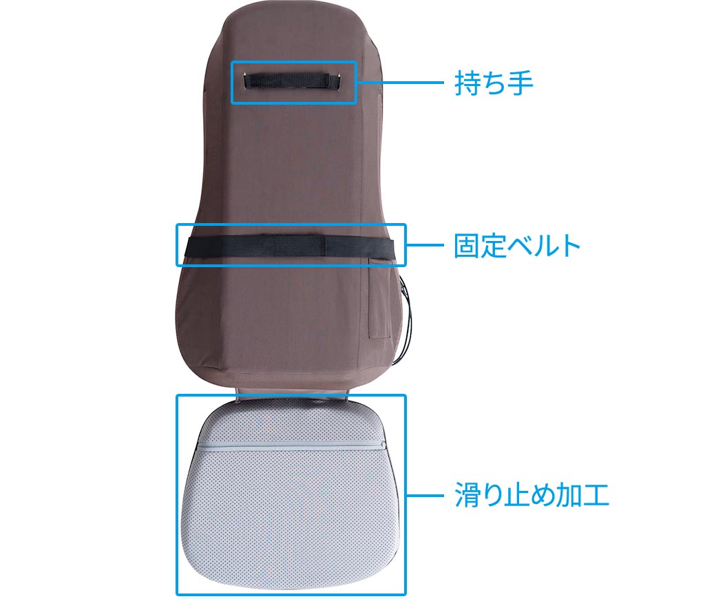 もみ玉によるマッサージの範囲は背面全体のほか、<肩まわり>や<腰まわり>だけの集中的なマッサージも可能。さらには、座面に搭載されたバイブレーション機能が太もも裏を心地よく刺激してくれます。