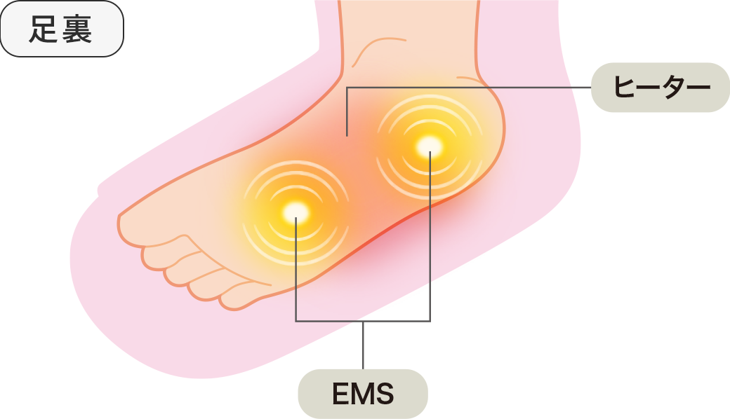 エアバッグによる加圧と同時に、足裏に当たる部分の2つの電極から筋肉に電気刺激(EMS)を与え、足裏からふくらはぎにかけて心地よくアプローチします。