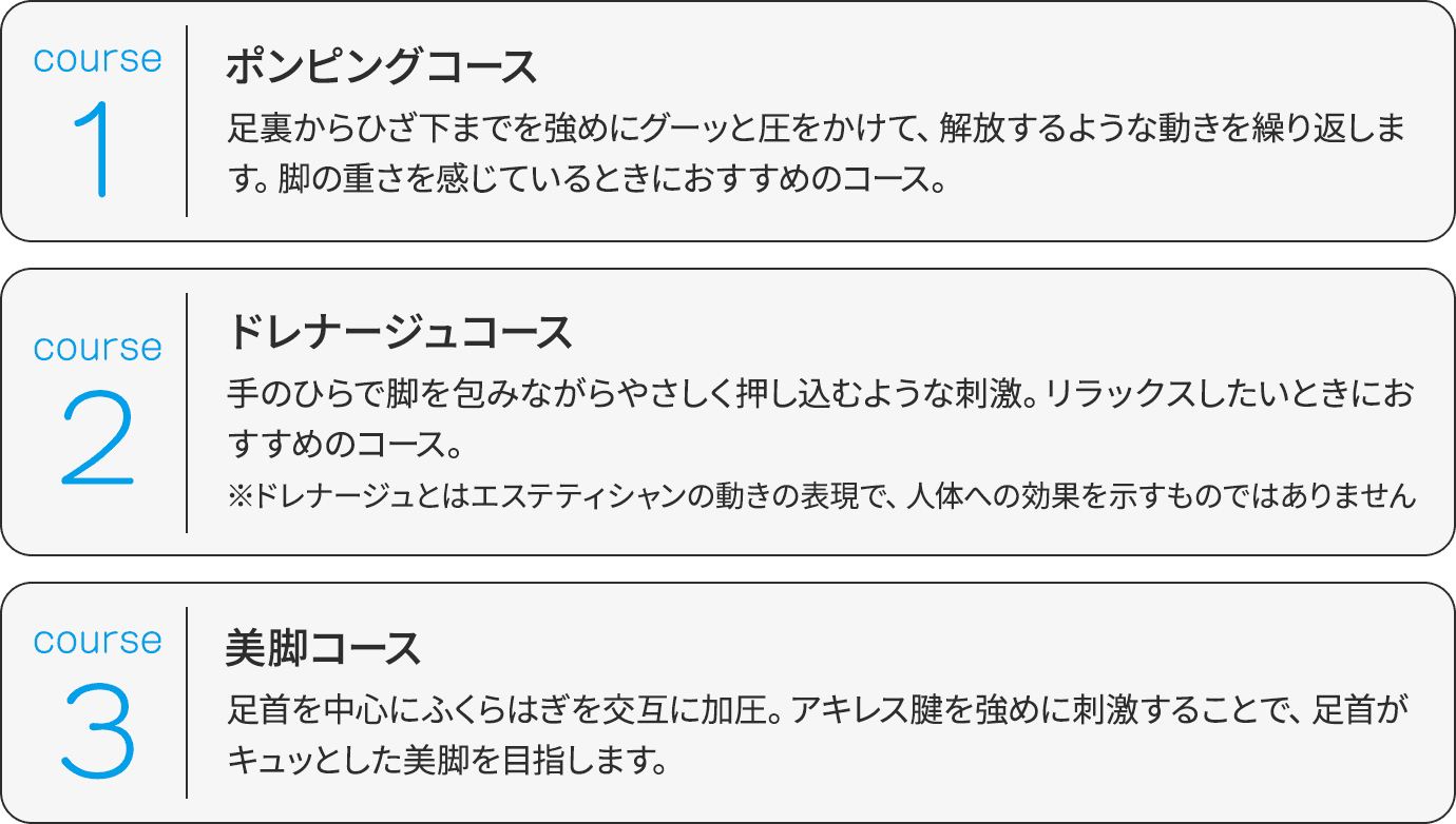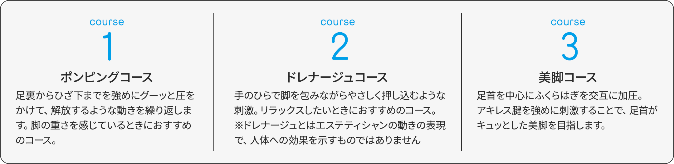 コースは3つ、エアの強度は3段階、ヒーターはON・OFF切り替えと2段階の温度調整があり、その日の状態や気分で組み合わせて、お好みのケアを味わうことができます。