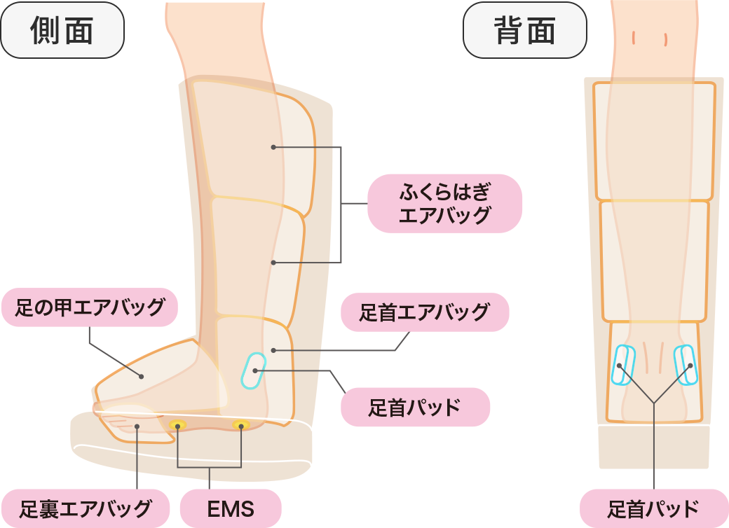 片足5箇所(ふくらはぎ上部、ふくらはぎ下部、足首、足の甲、足裏)にエアバッグを配置。