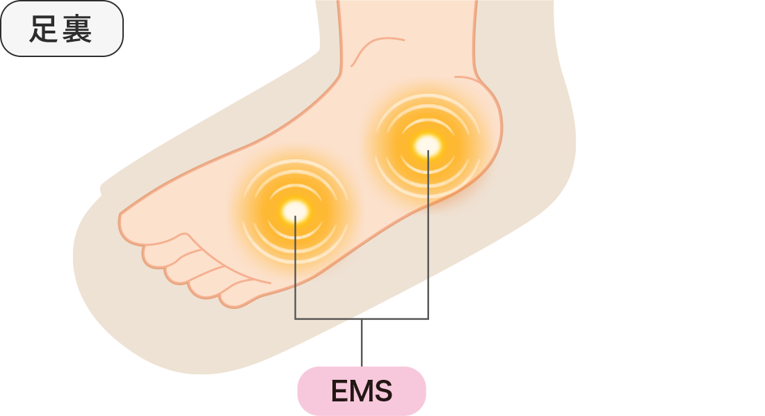 エアバッグによる加圧と同時に、足裏に当たる部分の2つの電極から筋肉に電気刺激(EMS)を与え、足裏からふくらはぎにかけて心地よくアプローチします。