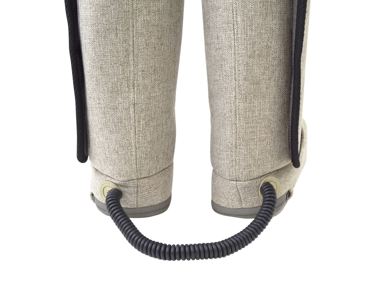 本体には左右を繋げるコードがありますが、伸縮可能なため、使用中に物を取りに行くなどちょっとした移動ができます。ブーツ底面には滑り止めが施されているのも嬉しいポイント。使用中は椅子やソファに座りながら、ベッドなどに寝ころびながらと、さまざまな状態でお使いいただけます。