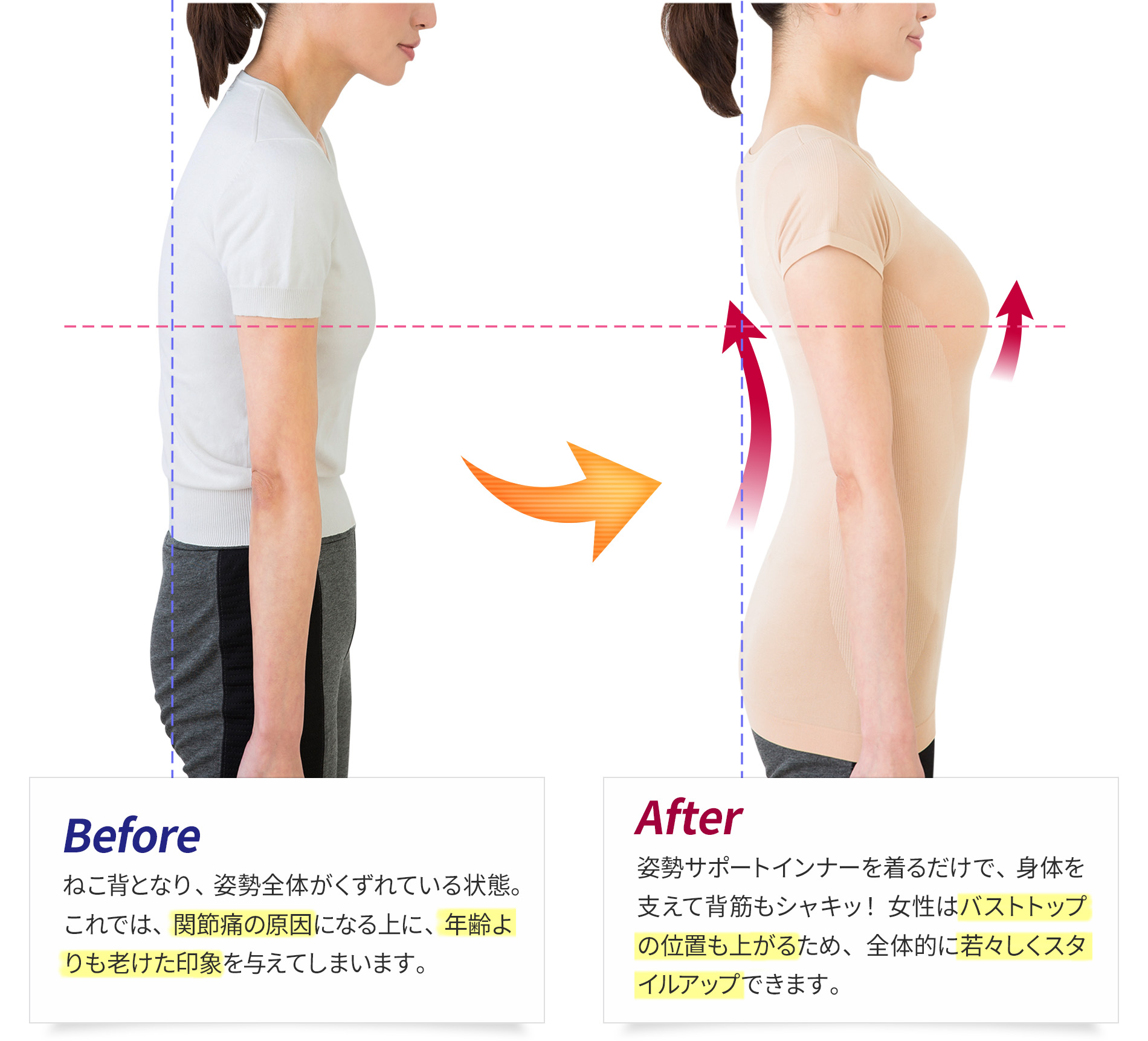 痛みケアのスペシャリスト酒井慎太郎が監修した「姿勢サポートインナー」。着用するだけで姿勢もスタイルもシャキッと整え、イキイキとした毎日を支えます。