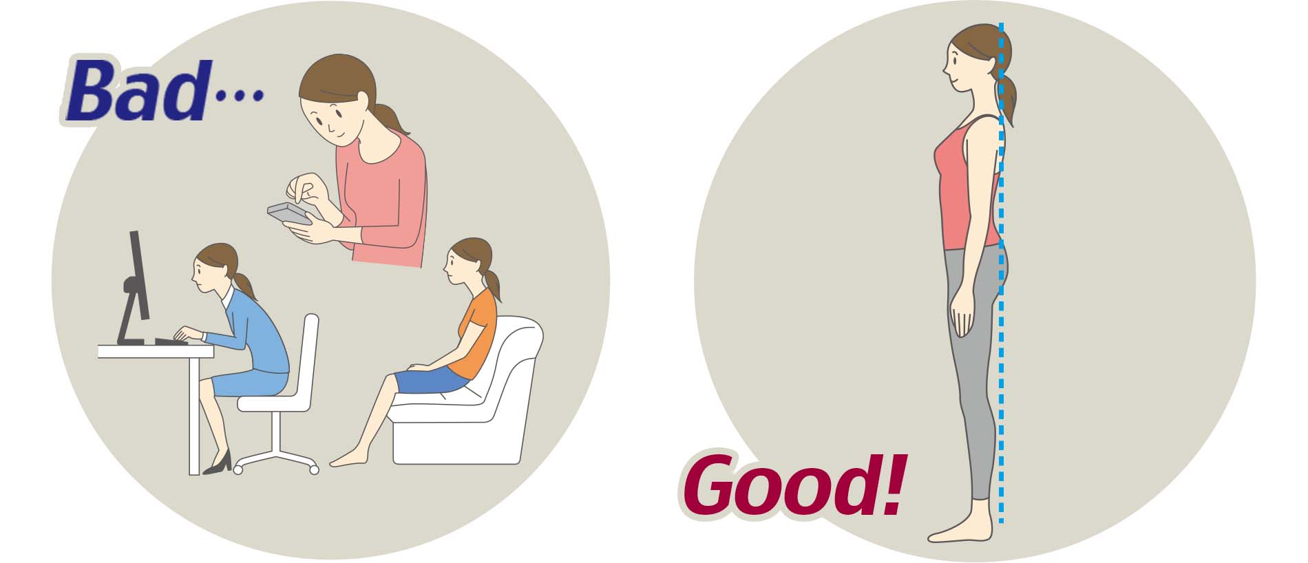 ねこ背は見た目の印象が良くないだけでなく、首、肩、腰、ひざなどの関節に悪影響をもたらします。パソコンを打つ時に背中を丸めたり、ふかふかのソファーに長時間体をしずませていたりと、ラクな姿勢ばかりとっていると関節や筋肉にかかる荷重バランスが崩れ、痛みやコリなどを引き起こします。