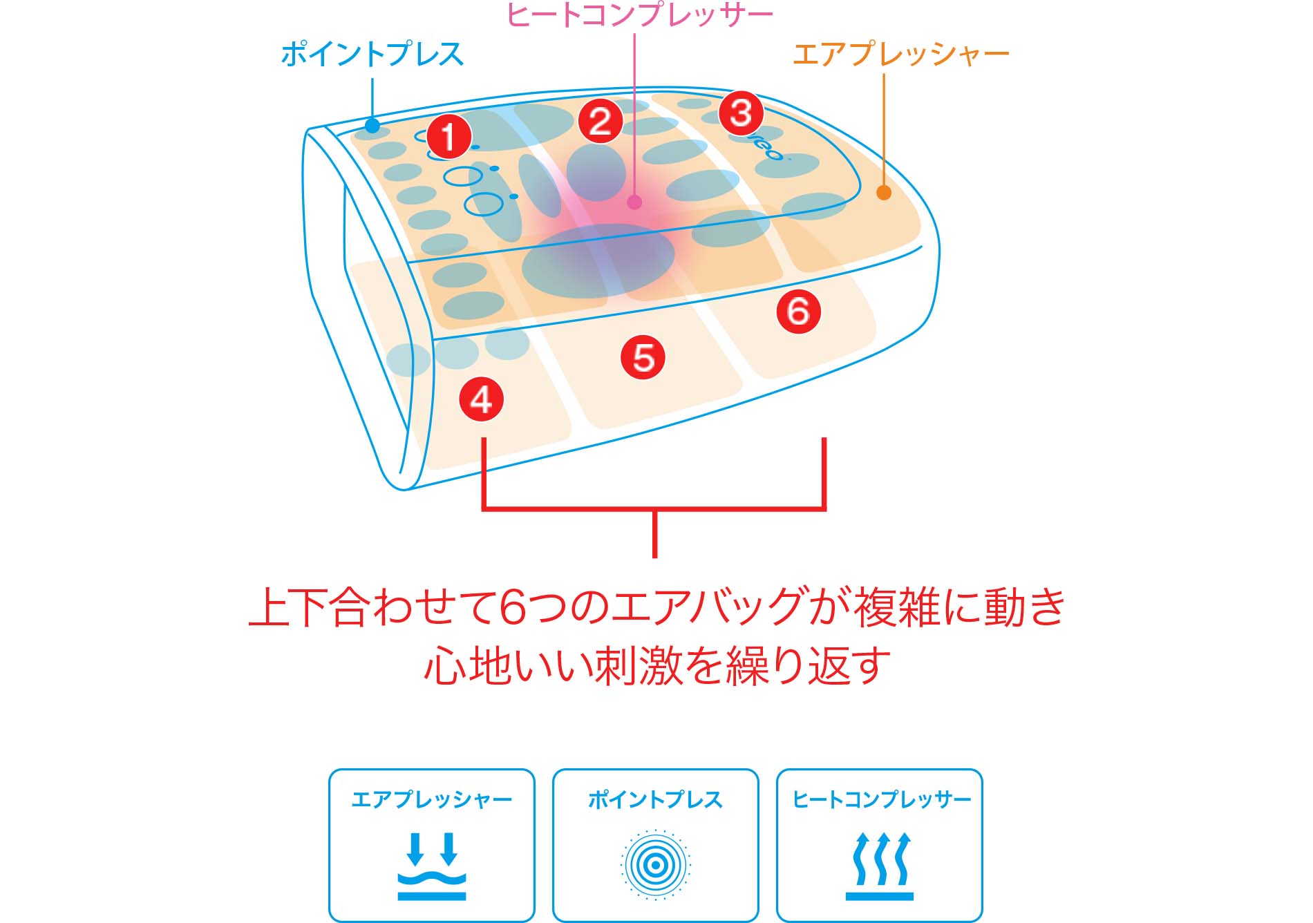 上下合わせて6つのエアバッグが、それぞれ手のひら、指の付け根、指先を刺激。3種類から、お好きなモードが選べます。ポイントプレスによる刺激も加わって、プロさながらにきめ細かくケアします。