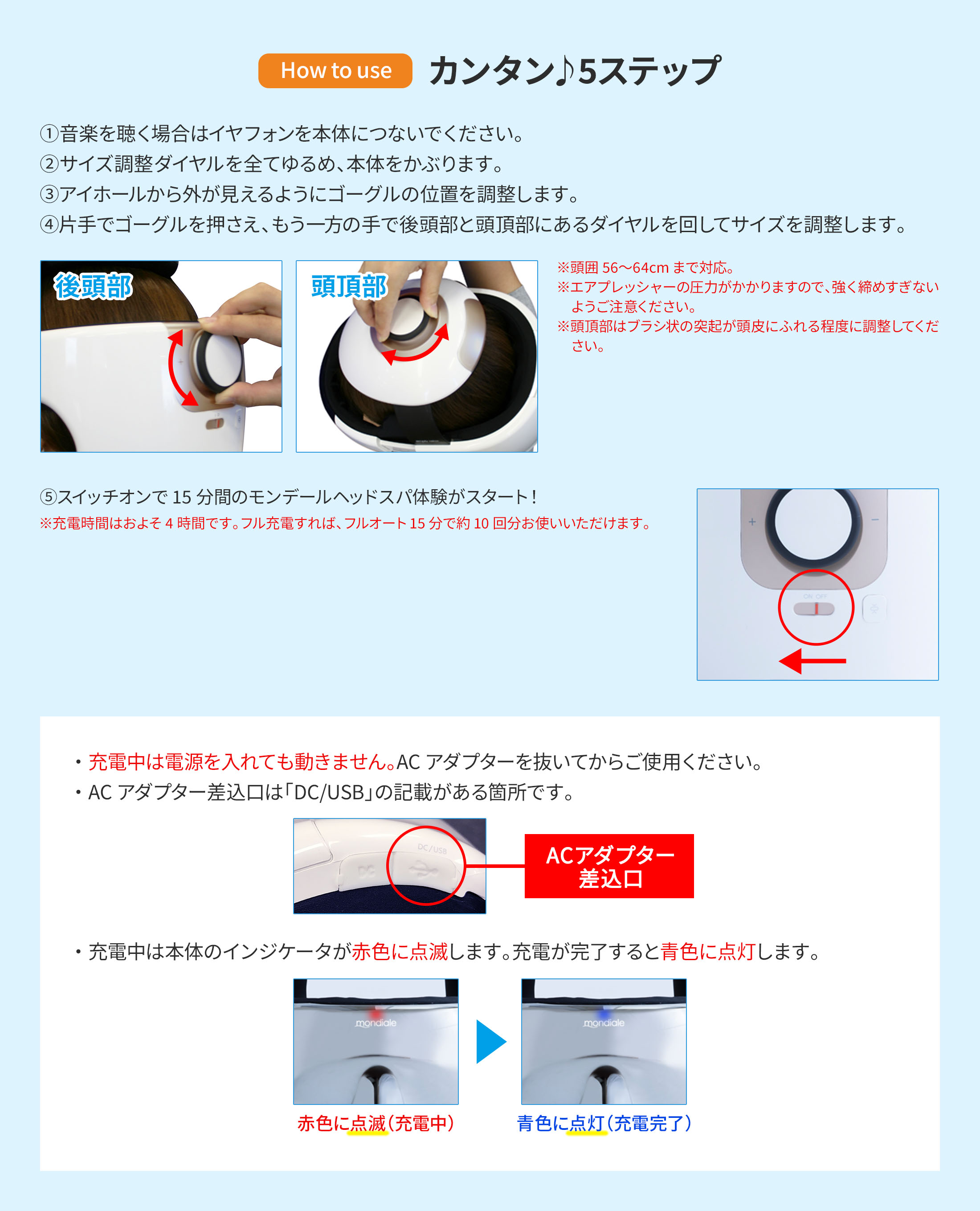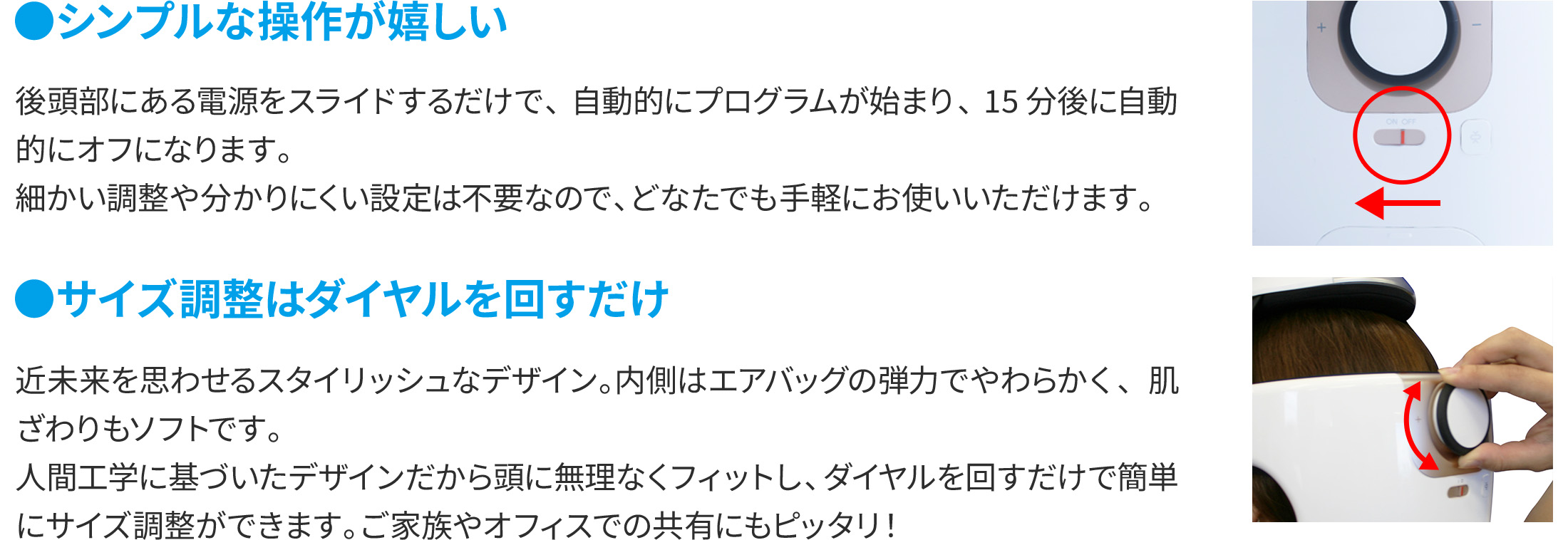 エアバッグが膨らんだり縮んだりを繰り返し、人の手でマッサージを受けているような気持ち良さが味わえます。また、ポイントを押すように設置された複数の細かな突起が頭頂部を心地よく刺激します。