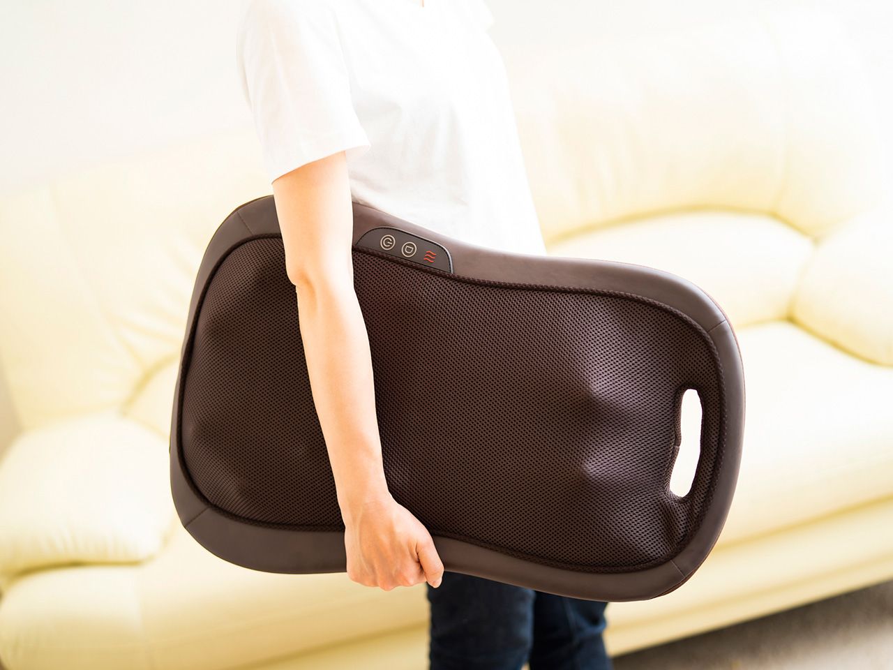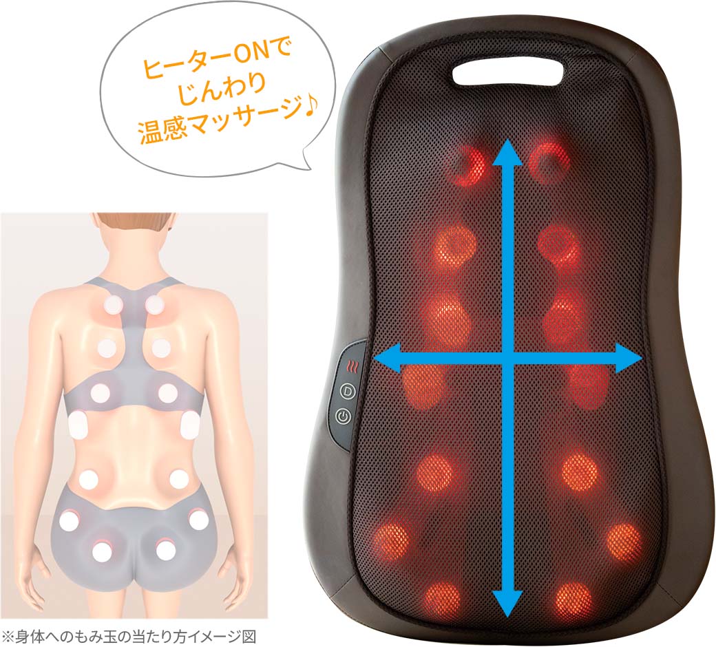 左右に7個ずつ計14個付いているもみ玉。付いている場所によって大きさや形状、高さが異なるので立体的にもみほぐせます。疲れが溜まりやすい背中から腰までのコリを、もみ玉が回転しながらしっかりとマッサージします。さらに、もみ玉はヒーター内蔵なのでヒーター機能をオンにすれば、じんわりと温めながらケアができてリラックス効果アップ。