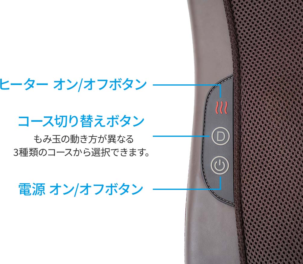 少ないボタンながら、本格的なもみ心地。もみ玉が左右同時に動くコース、左右交互に動くコース、左右同時と左右交互の動きが1分ごとに切り替わるミックスコースの3種類からお選びいただけます。