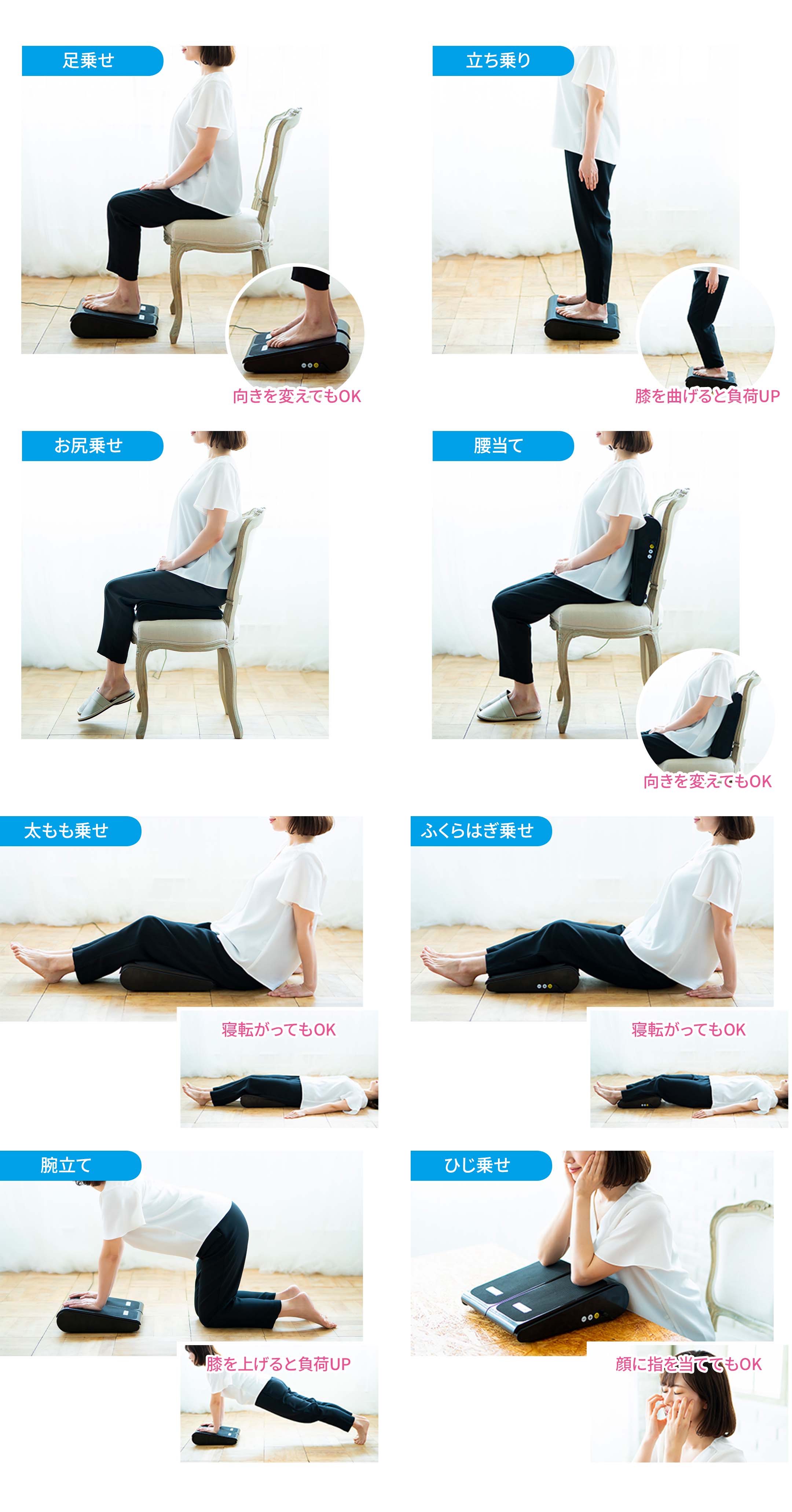 使い方はさまざまで、商品の上に立ったり寝転んで使用したり、商品を椅子やテーブルに乗せて使うこともできるので、下半身だけではなく上半身やお顔など、ご自身の気になる部位にダイレクトにアプローチができます。