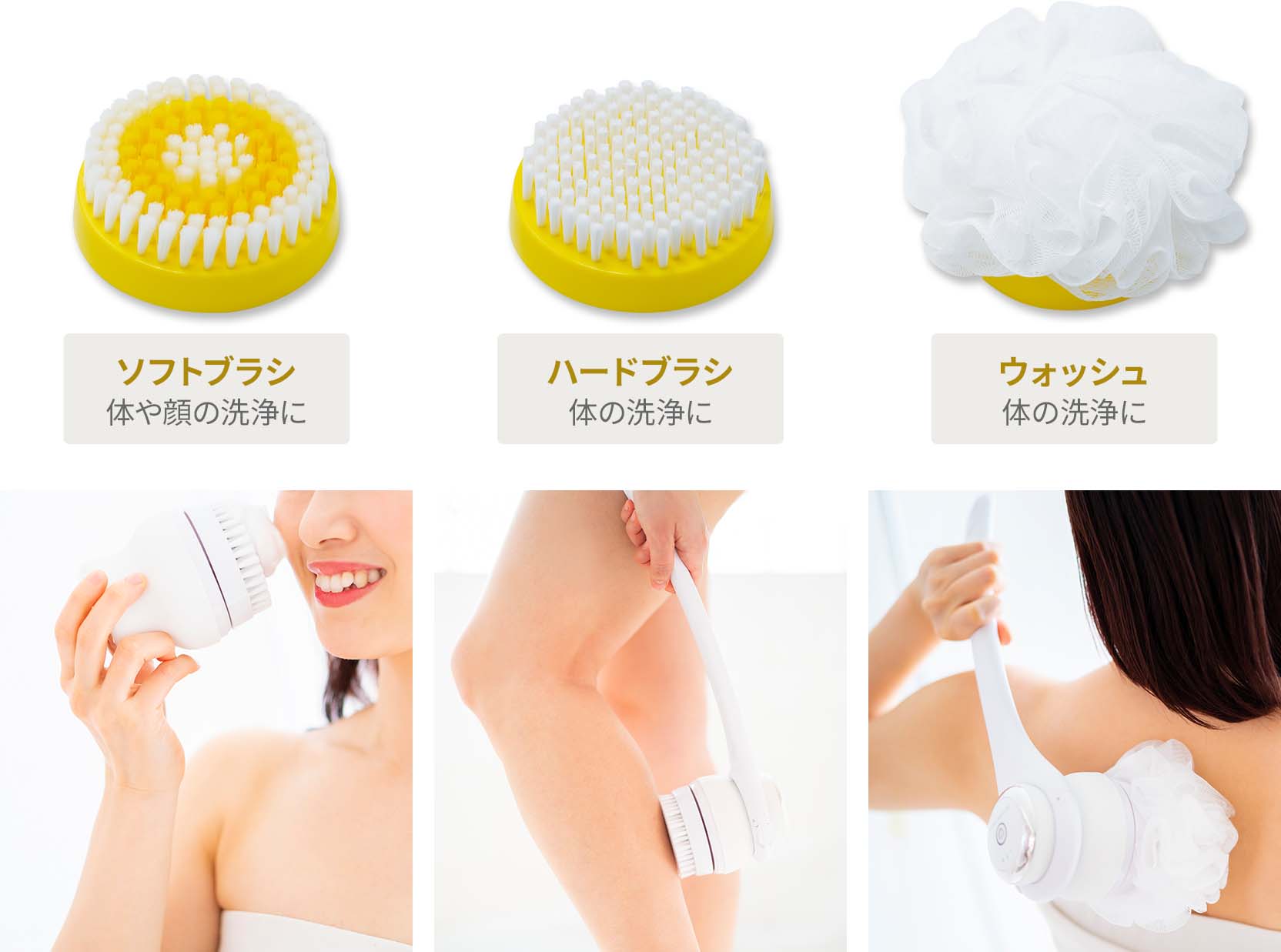 ほどよい硬さがあるハードブラシと泡立てネットボール状のウォッシュアタッチメントは体の洗浄に、肌触りがやわらかいソフトブラシは体はもちろんお顔にも使用できます。