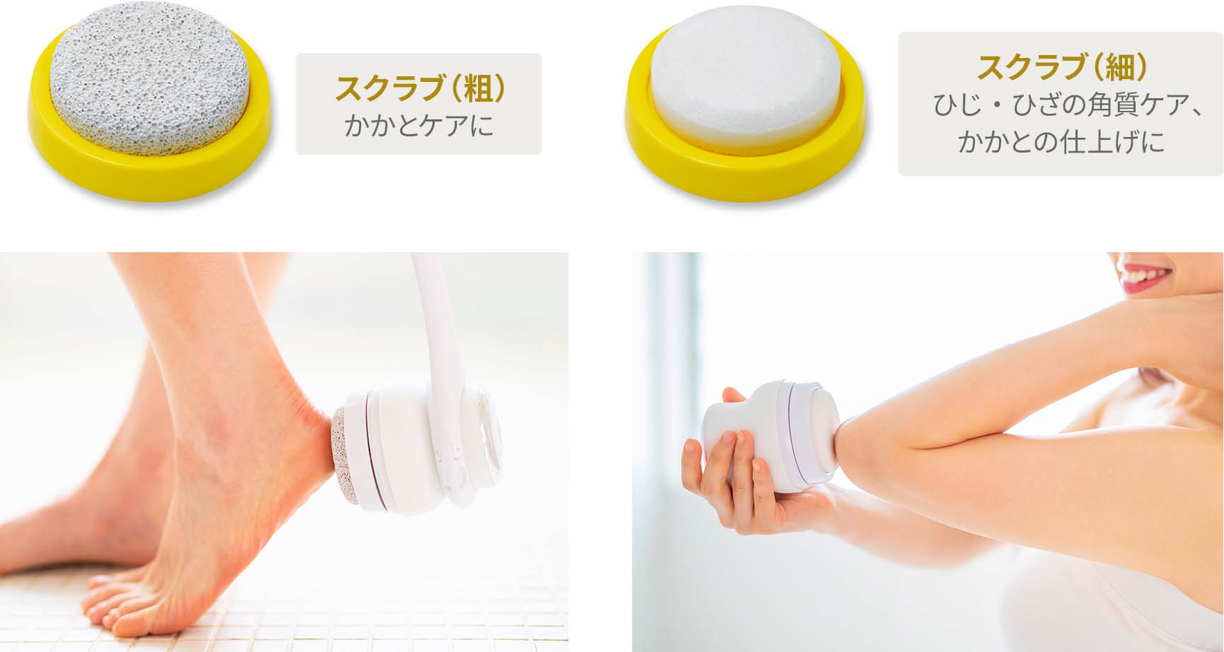 スクラブアタッチメントは2種類。目が粗いものはかかとの角質ケアに、目が細かいものはひじやひざの黒ずみケアやかかとケアの仕上げに使用できます。