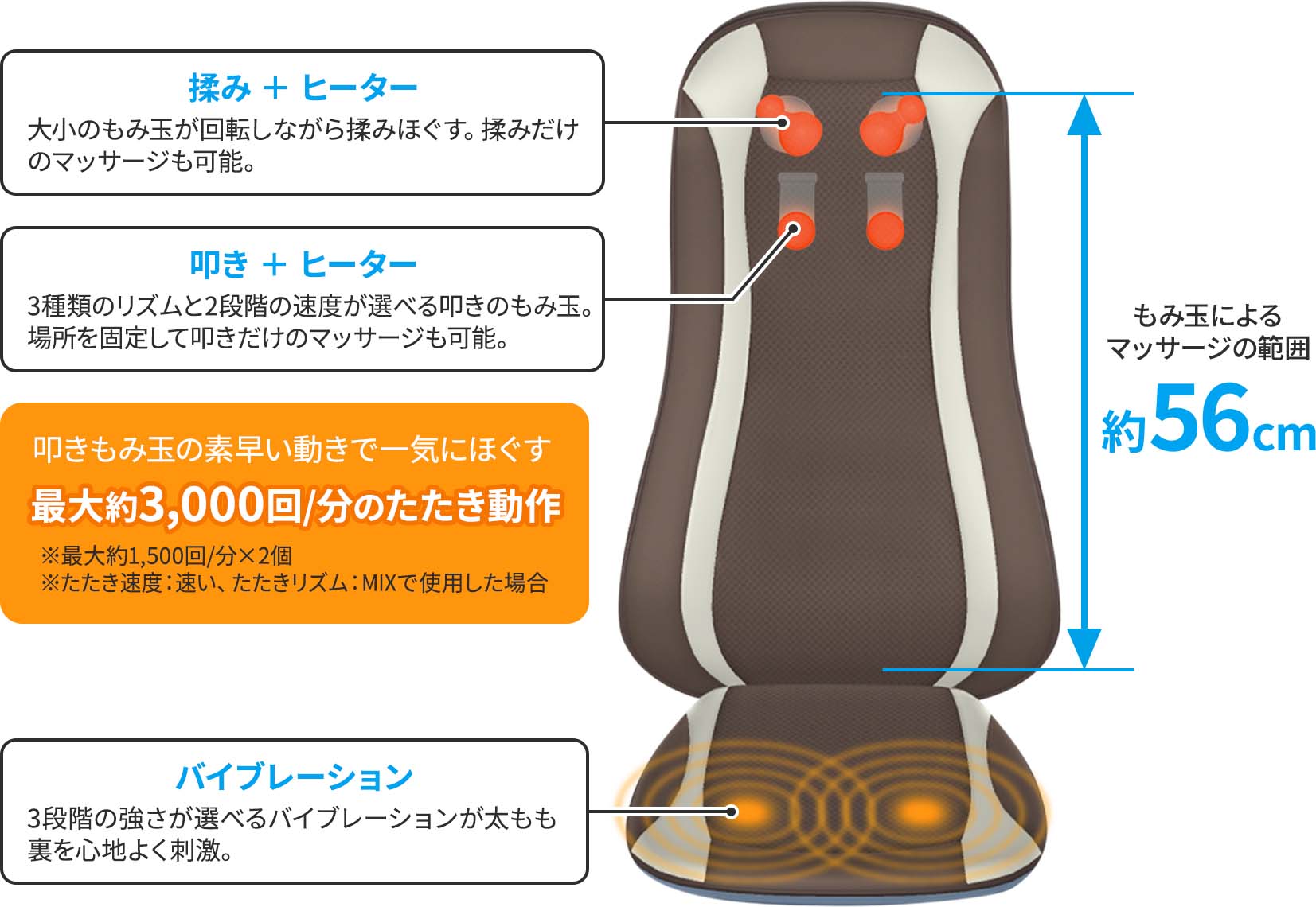 もみ玉によるマッサージの範囲は背面全体のほか、<肩まわり>や<腰まわり>だけの集中的なマッサージも可能。さらには、座面に搭載されたバイブレーション機能が太もも裏を心地よく刺激してくれます。