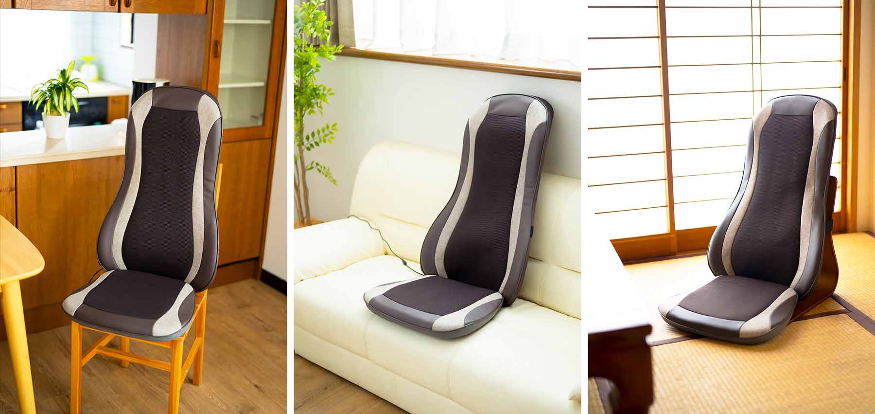 また、椅子やソファに立てかけて寄りかかって使用することはもちろん、床やベッドに広げて寝ながらもご使用いただけます。寝ながら使用することで自重が加わり、より強く深い揉み心地を味わえます。