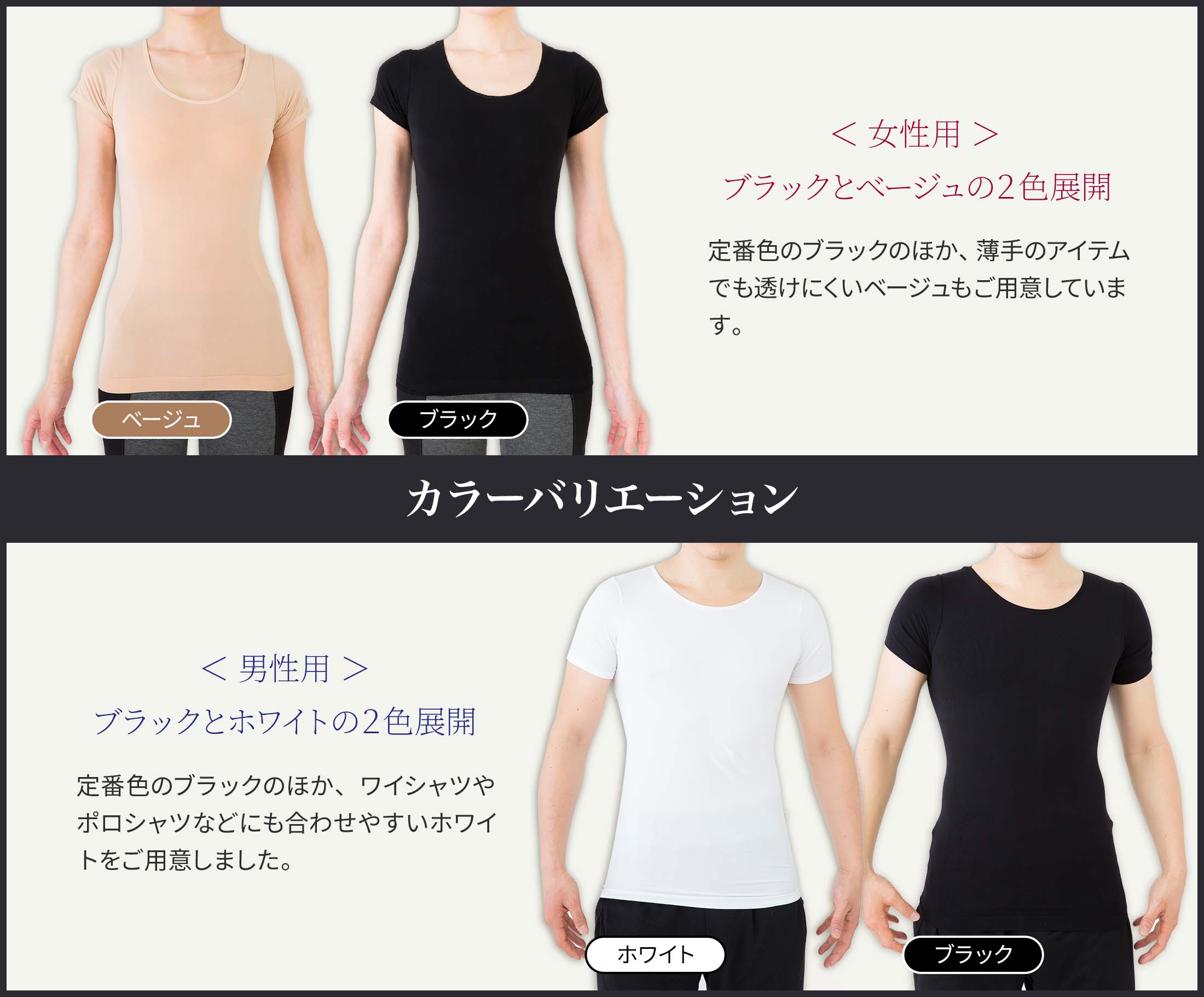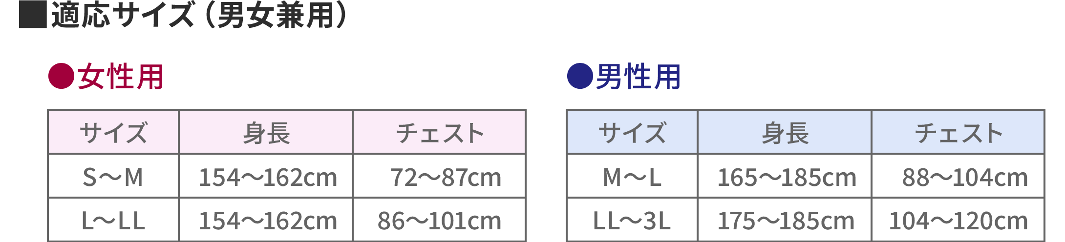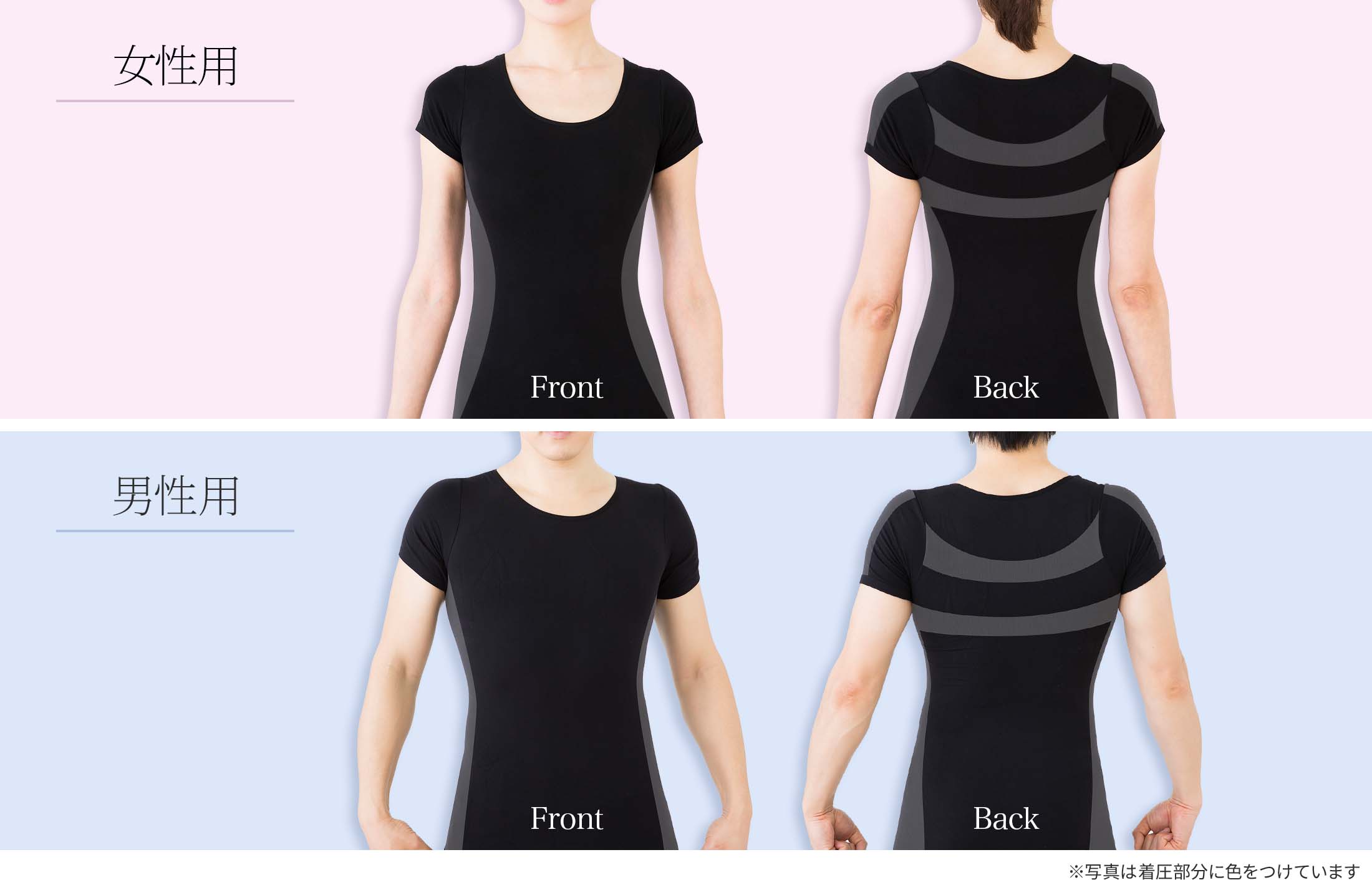 女性用は、側面部分を着圧することでムダなお肉を抑えてくびれを強調。男性用は、お腹まわりをしっかりサポートしてスタイルよく見せます。