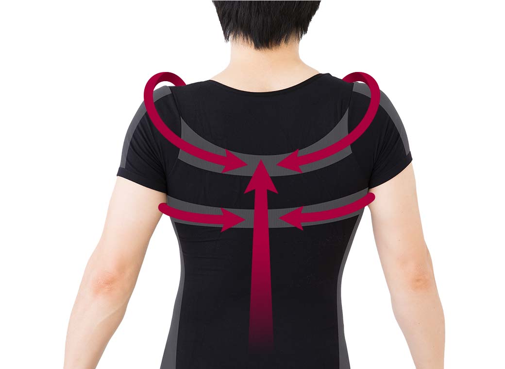 背中部分を着圧することで、ねこ背になりがちな背筋をピン!自然に姿勢のよい体勢を習慣づけることができます。